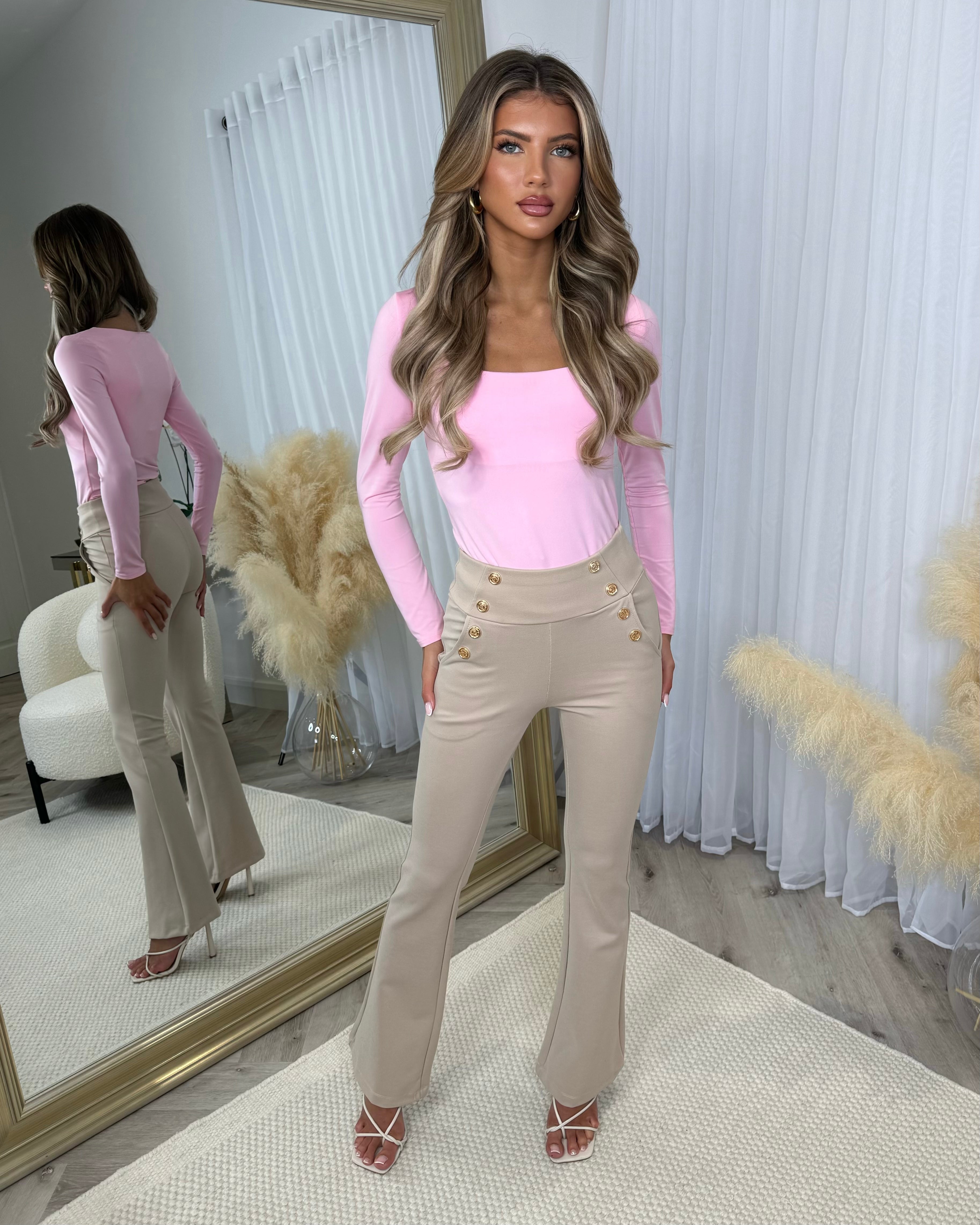 Cherice Gold Button Flare Trousers- Beige