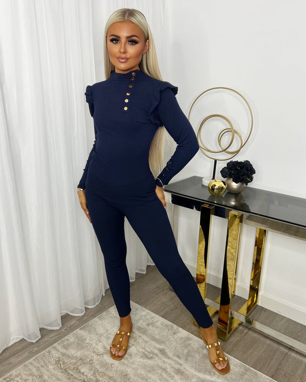 Evie High Neck Gold Button Loungewear Set - Navy