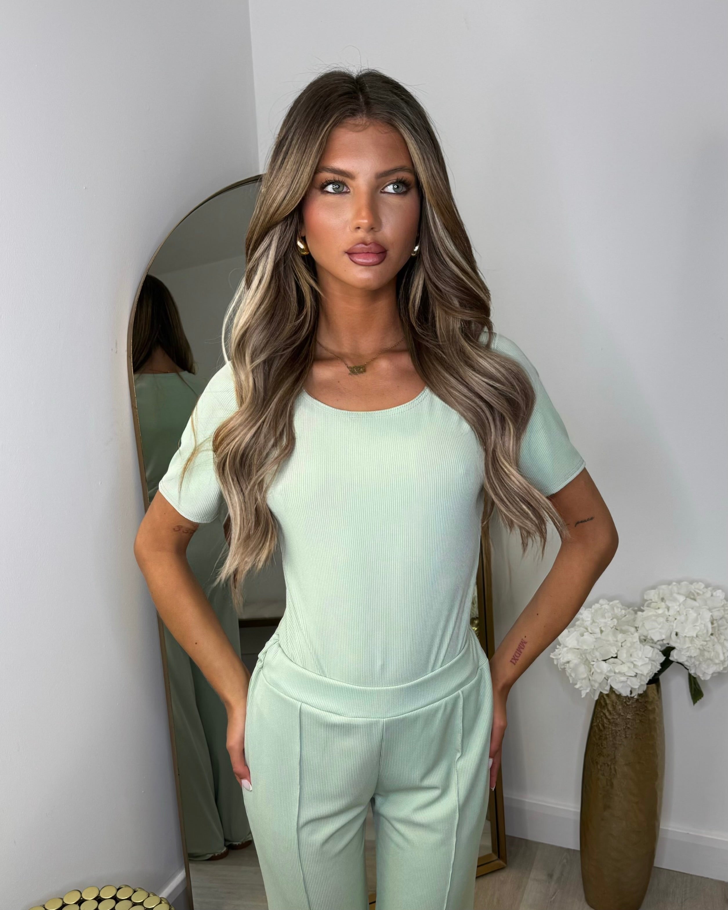 Libby Ribbed Bodysuit & Wide Leg Trousers - Mint